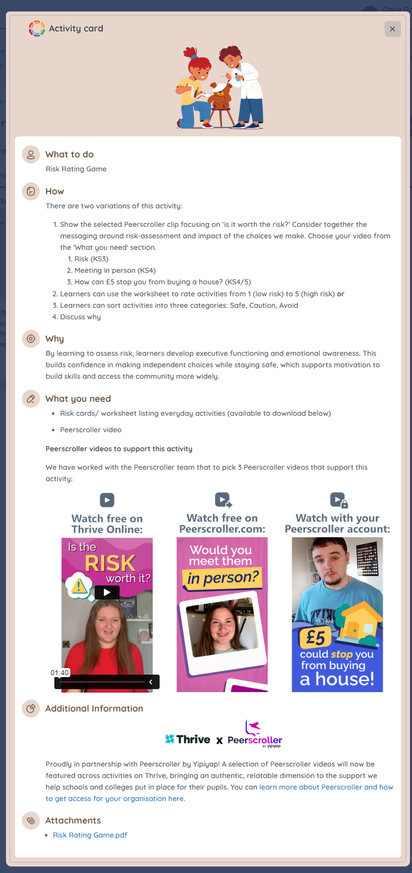Selected Peerscroller videos for each activity will be made freely available to Thrive users, with further relevant content signposted for users with a Peerscroller account.